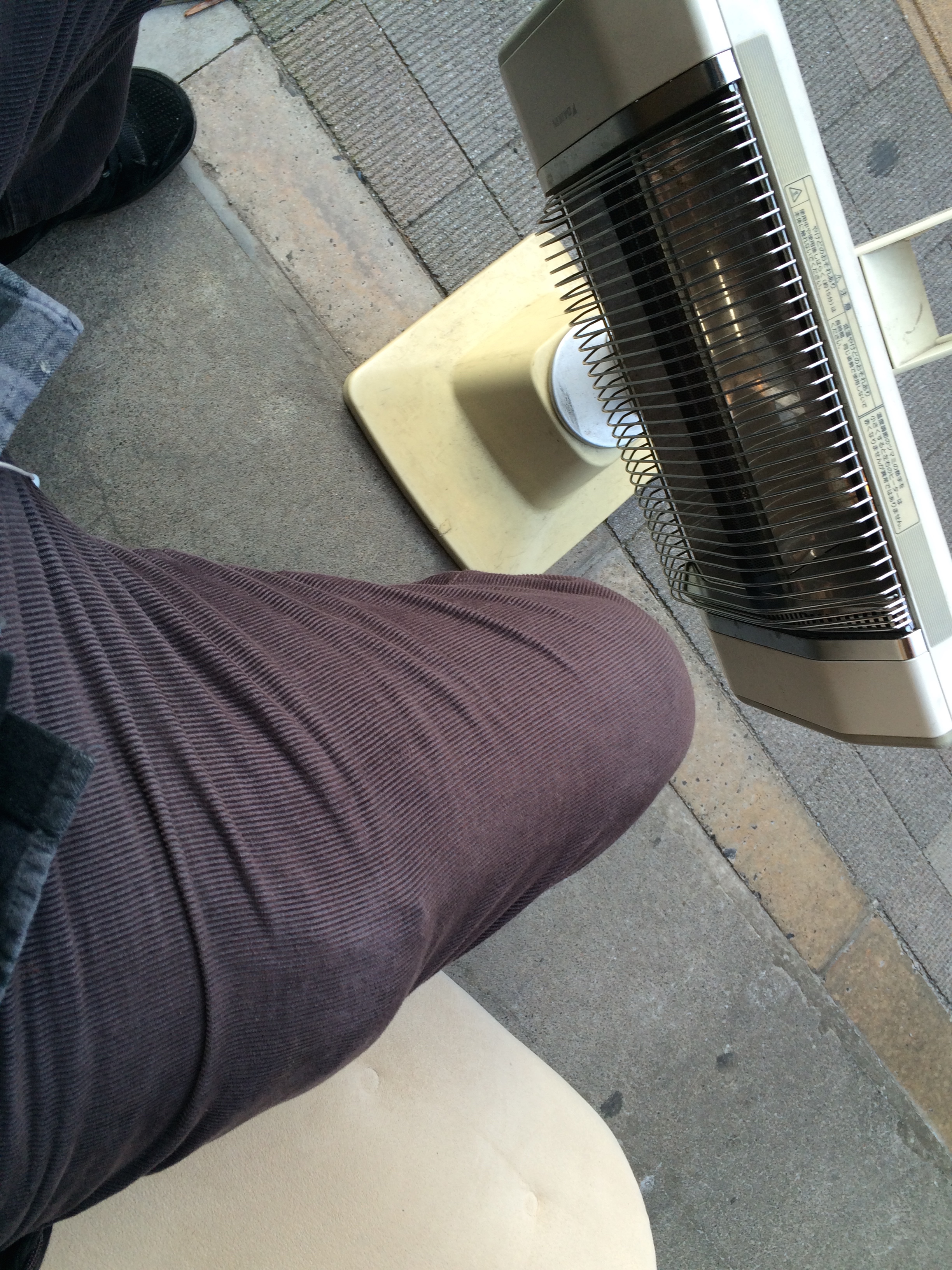 Finally, 4:30 came around and I meandered back over to the relatively humble storefront. Finding myself immediately instructed to wait by one of the nice dudes working at the shop, I sat down at the head of a long row of chairs jammed unceremoniously between the wall and some space heaters. I only lasted about two minutes before it felt like my legs were about to melt, mostly because the heater was approximately five millimeters away from my calves and was apparently cranked up to roast.