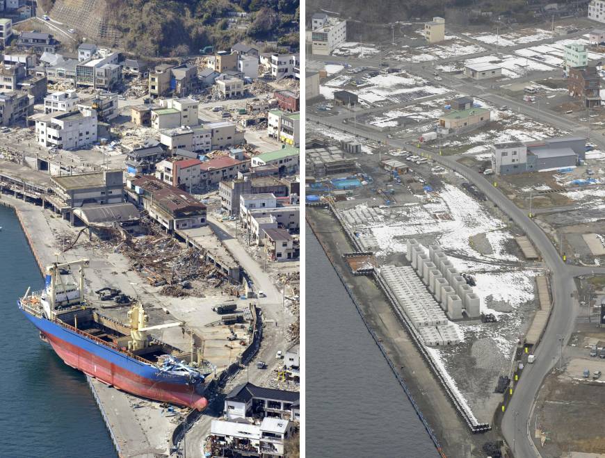 Kamiashi in Iwate Prefecture in 2011 and 2014 (Kyodo)